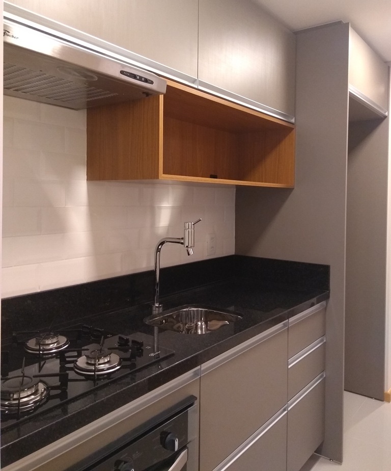Uma cozinha atual, prática e com ótima relação custo x benefício. Este foi o saldo de um projeto desenvolvido para um cliente que nos procurou para executar uma obra de interiores em um apartamento padrão localizado em Blumenau, Santa Catarina. O imóvel foi comprado para investimento e será alugado. Por isso, a proposta era criar um ambiente neutro, mas que também fosse moderno e atraente.